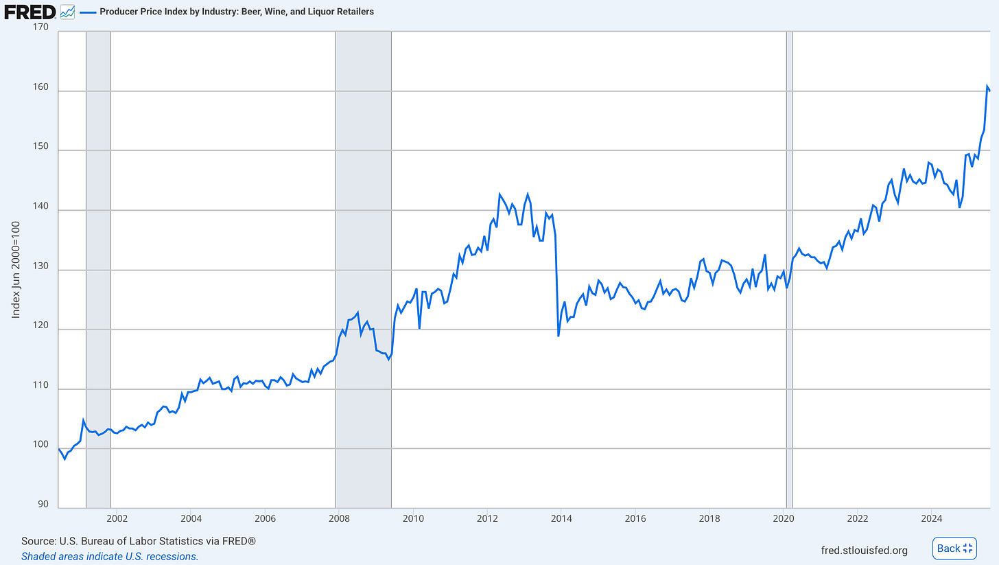Though wine has decreased by about 5% this year as a store of value, it is not cheaper for consumers - restaurants and liquor stores have kept prices higher after sharp increases in 2022-23. Consumer price data implies retailers have hiked since. With alcohol PPI skyrocketing, who can blame them?