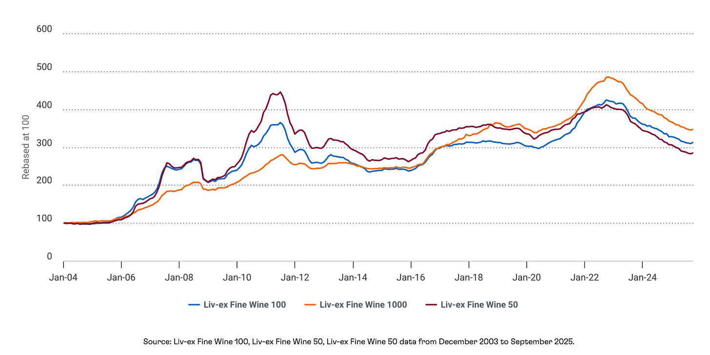 Since pandemic drinking and inflation spikes, wine cellar values have broadly declined back to pre-covid levels based on the Liv-ex (London International Vintners Exchange) 1000 bottle market index1.